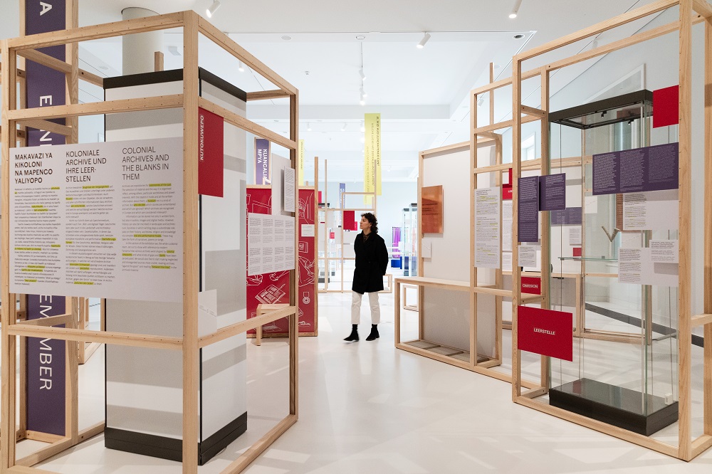 The exhibition addresses the problematic colonial and racist past of the objects through various sections. For instance, four display cases featured original objects from the former colony of “German East Africa” replaced with “surrogate objects” by contemporary artists. This approach allows sensitive objects to gain visibility and be viewed through a new, contemporary lens. Omissions and gaps in archives and historiography are also highlighted, marked by blank text boxes and pink-colored fields.